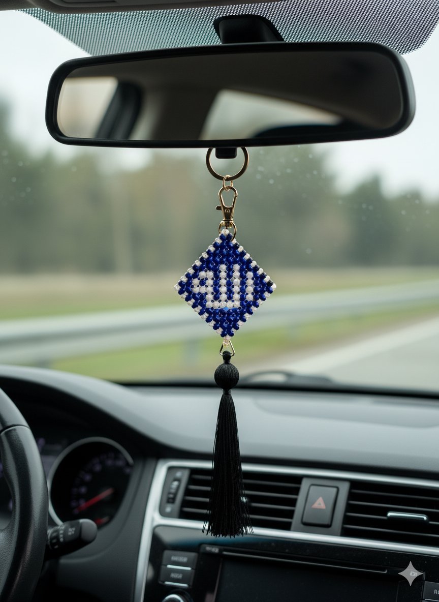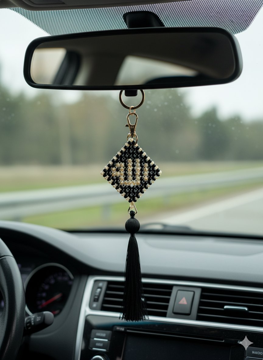 Carry a piece of spiritual inspiration wherever you travel with this exquisite beaded car hanging and keychain. Meticulously handcrafted, this piece features the revered name of Allah (SWT) spelled out in a stunning pattern of black and off-white beads. The detailed work is framed in a diamond shape, symbolizing strength and eternity.