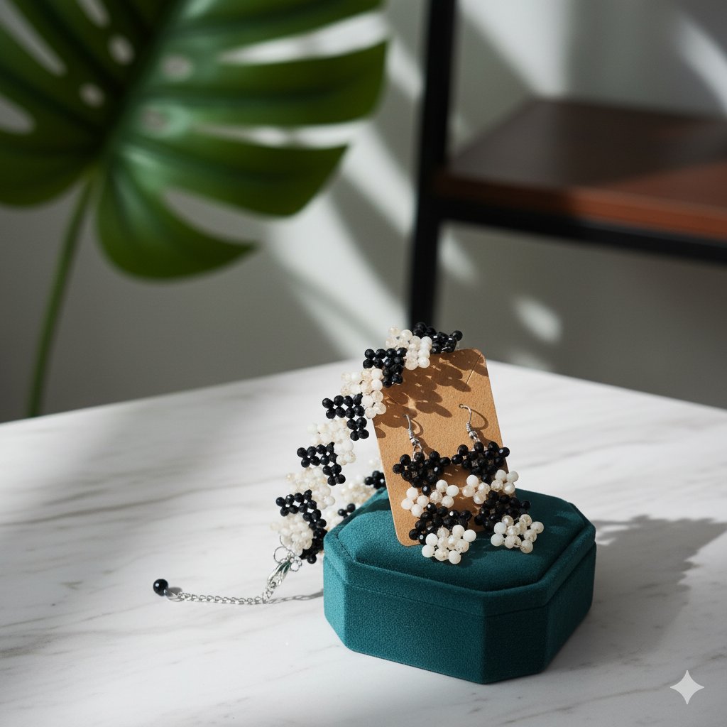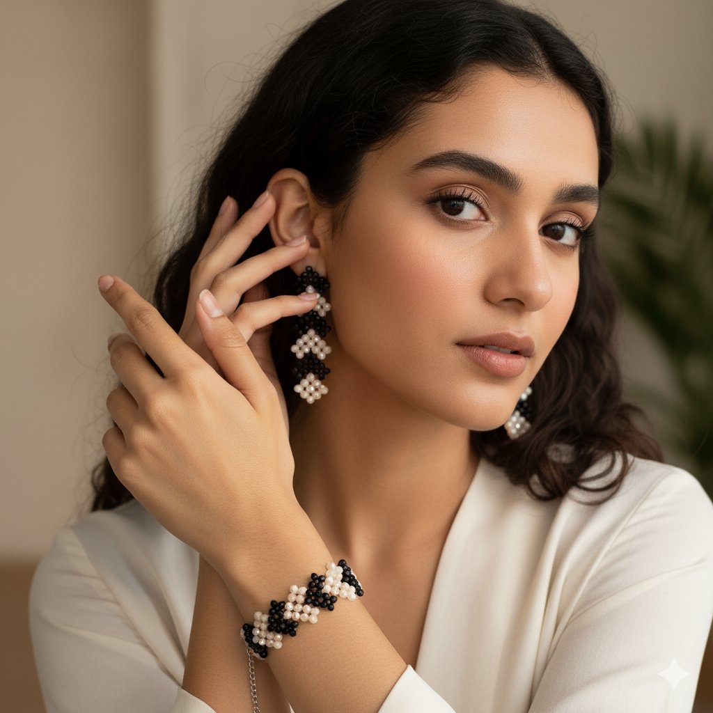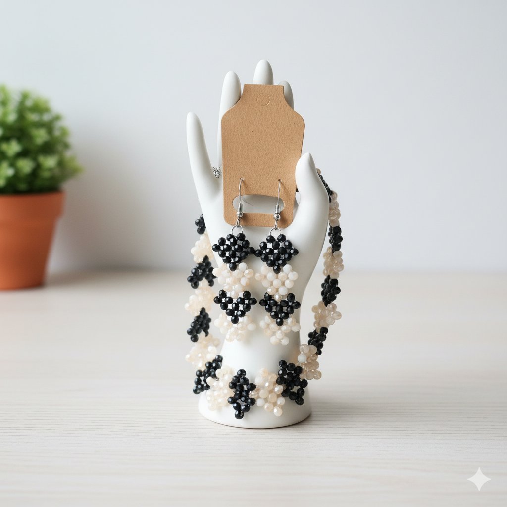 Introducing our exquisite hand-beaded Black and Cream Jewelry Set, a true labor of love and artistry. This set includes a beautiful cuff-style bracelet and matching dangle earrings, both meticulously crafted with high-quality seed beads. The timeless combination of deep black and creamy off-white/pearl beads creates a striking contrast in a charming floral or repeating geometric design.