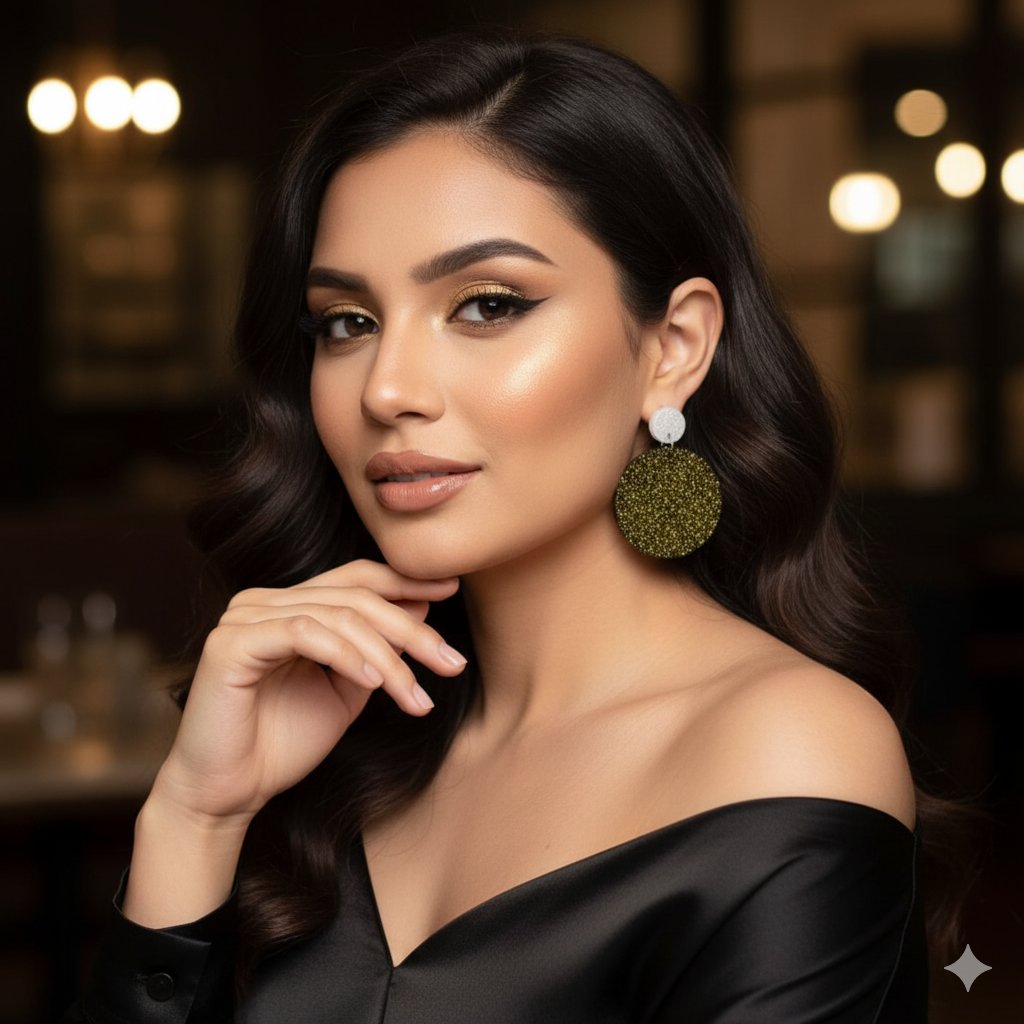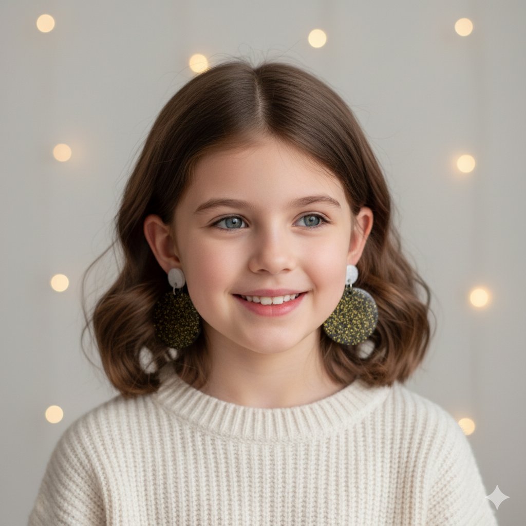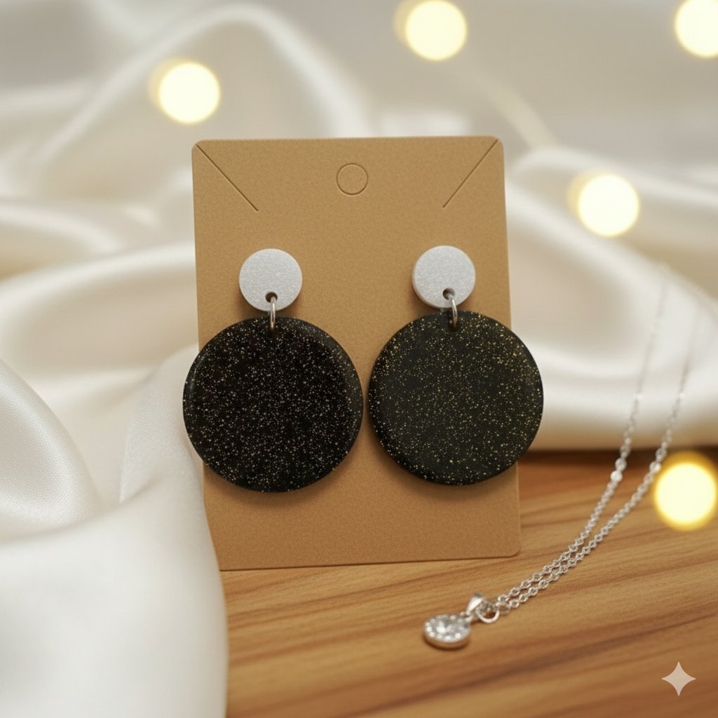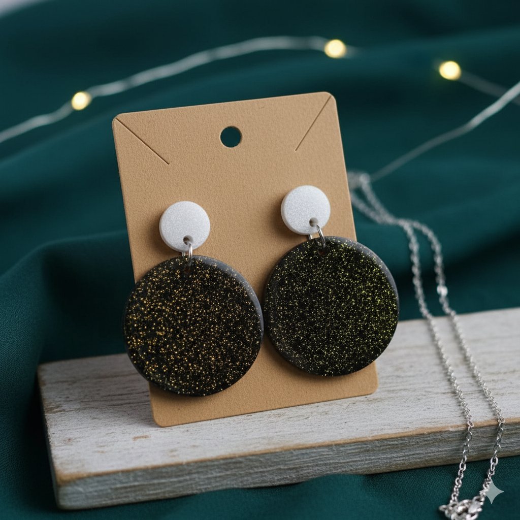 Elevate your accessory game with these stunning Glittering Black & Gold Circle Dangle Earrings. The main body features a bold, large circle disc with an eye-catching black base heavily sprinkled with brilliant gold glitter, catching the light beautifully with every movement. The earring is topped with a simple yet elegant small white post stud for a classic finish. They are designed to be lightweight for comfortable all-day or all-night wear. These earrings make a fabulous statement piece for a holiday party, New Year’s Eve, a formal event, or just to add some glam to your everyday look. They also make a fantastic gift for a friend or loved one who loves a bit of sparkle!