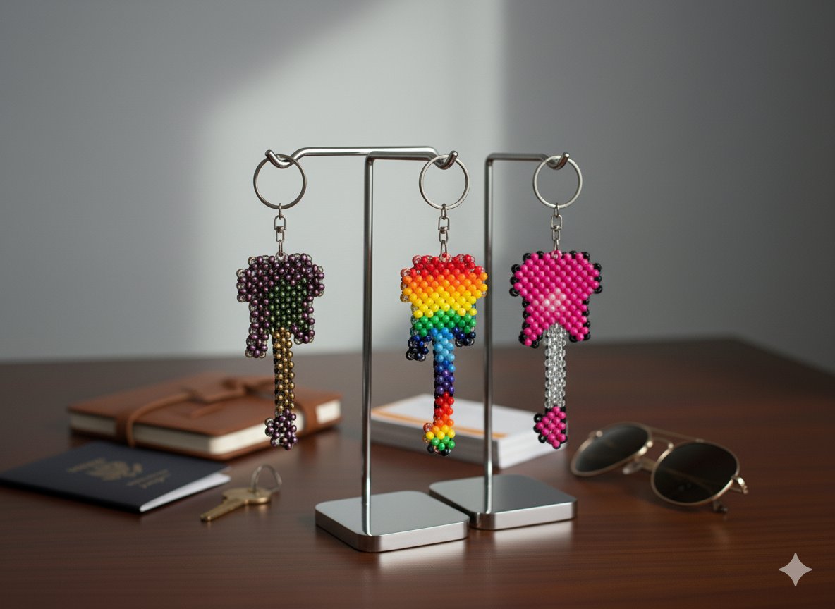These unique, handmade keychains are shaped like miniature electric guitars, crafted from colorful glass seed beads. They are the perfect accessory for musicians and music lovers.